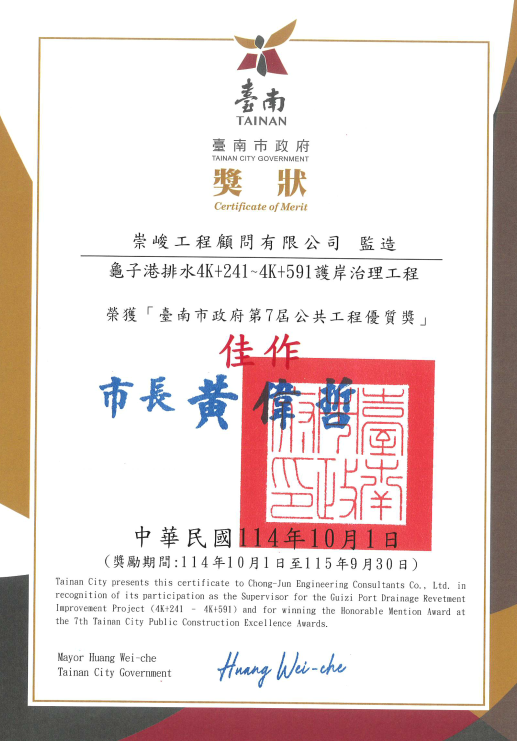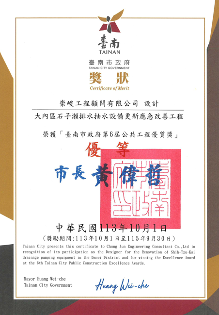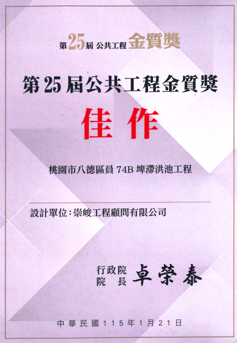 | 114年桃園市政府第九屆公共工程金品獎-優等 | 桃園市八德區員74B埤滯洪池工程 |