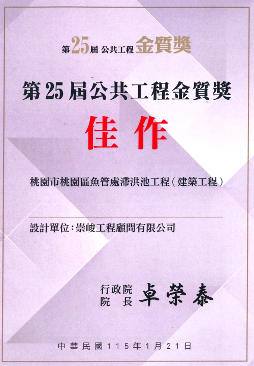 | 114年桃園市政府第九屆公共工程金品獎-特優等 | 桃園市桃園區魚管處滯洪池工程(建築) |